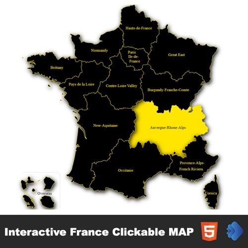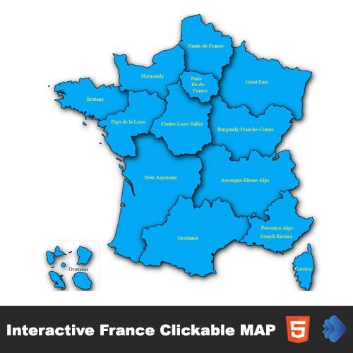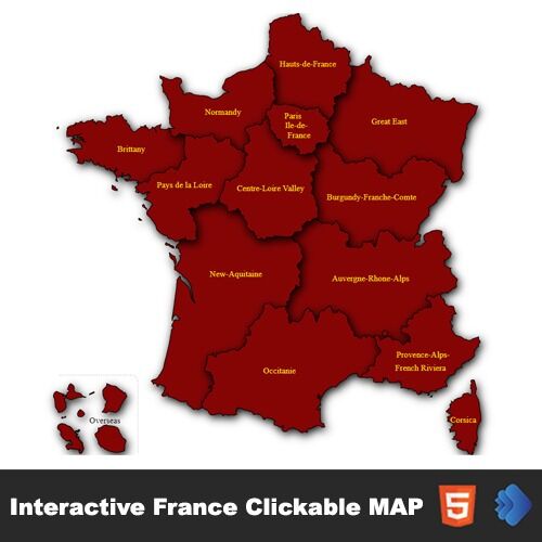 Interactive France Map template shows you the names of each professional Interactive each state is clickable. You can use the code by copying and pasting it on any web site page (html page, WordPress, php website, shopify, Wix, SquareSpace, Joomla and other CMS’s).